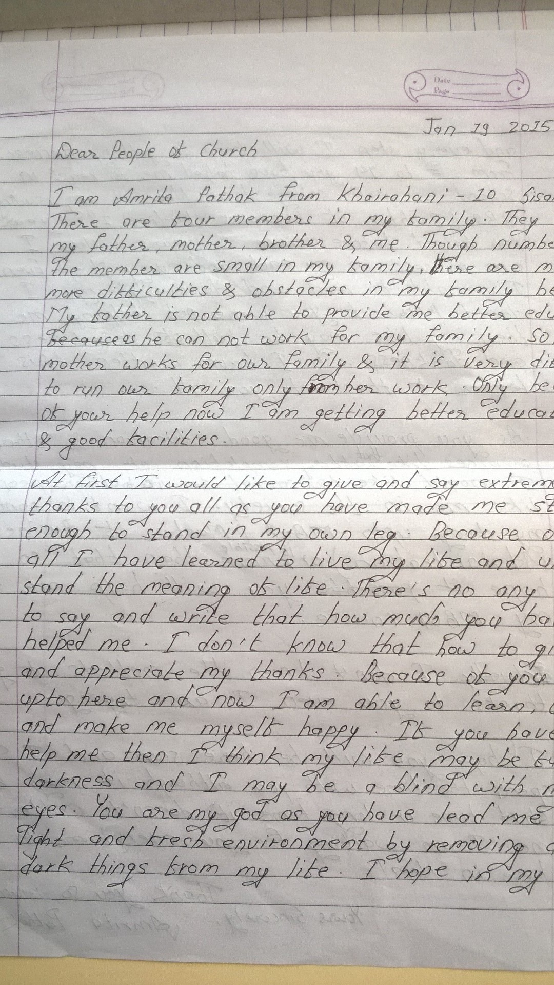 Van Amrita, de studente uit Nepal, die dankzij uw steun naar school heeft kunnen gaan en nu een opleiding tot Bachelor of Business Administration volgt, ontvingen wij bijgesloten brief met foto: Brief van Amrita Pathak dd 19-01-2015