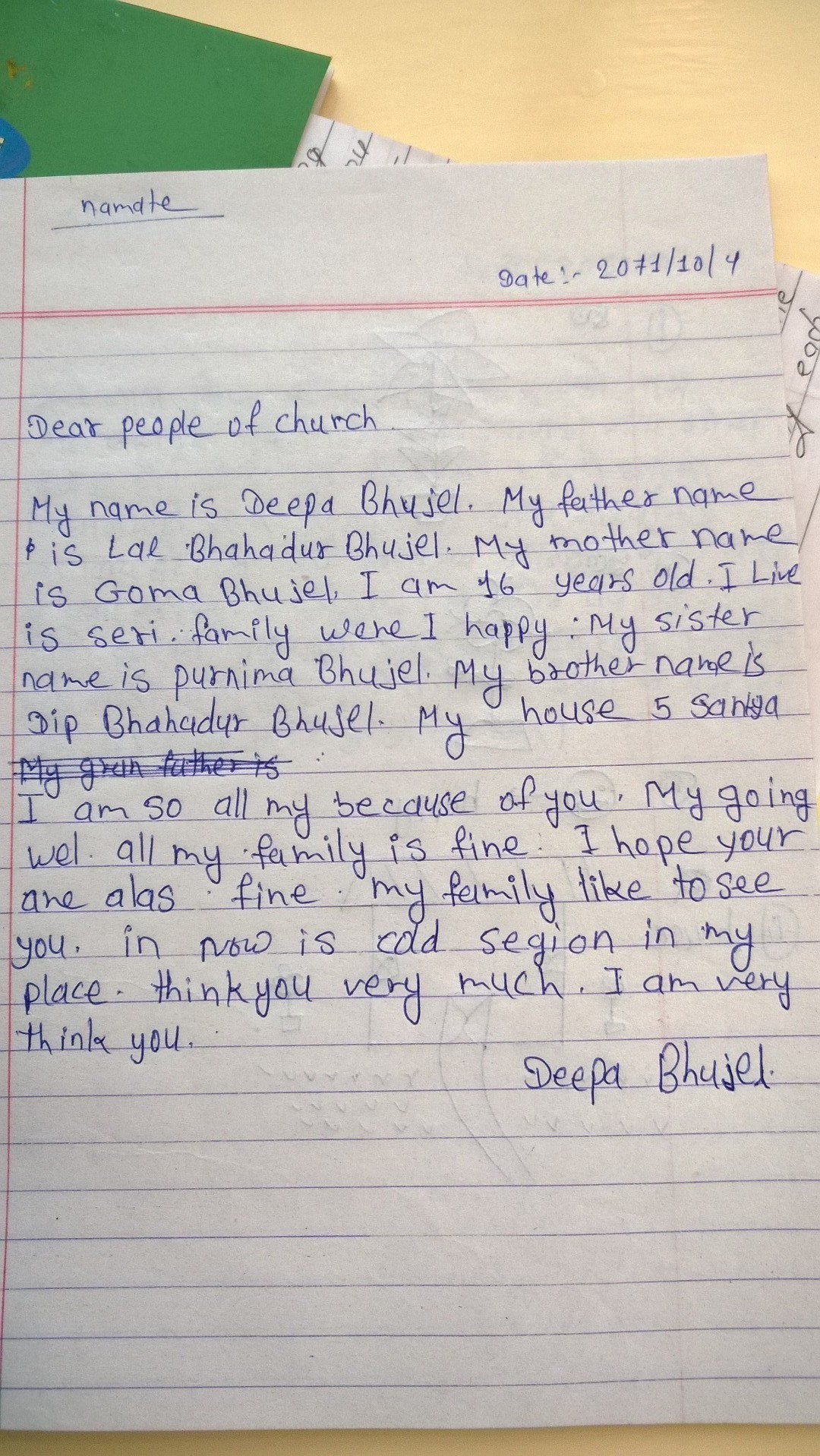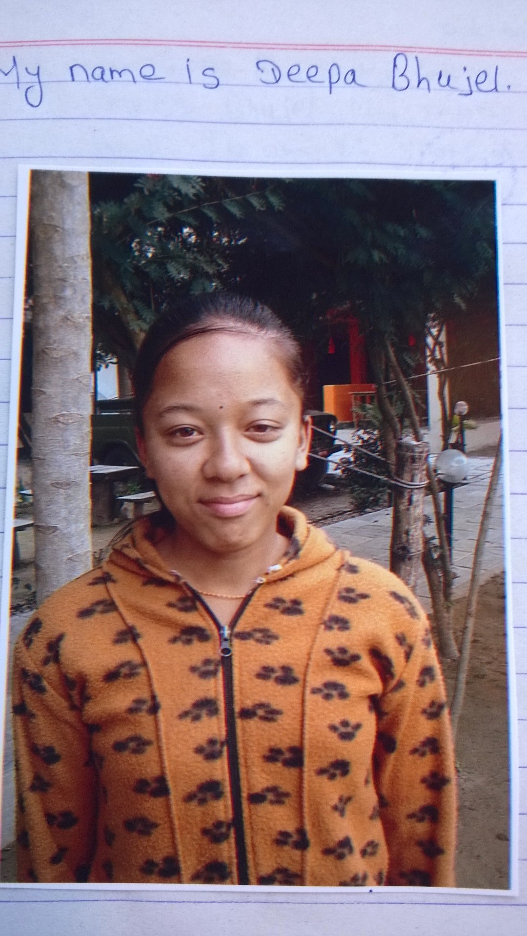 Ook Deepa, een van de Nepalese leerlingen, waarvoor wij het schoolgeld betalen, stuurde ons een foto en briefje: